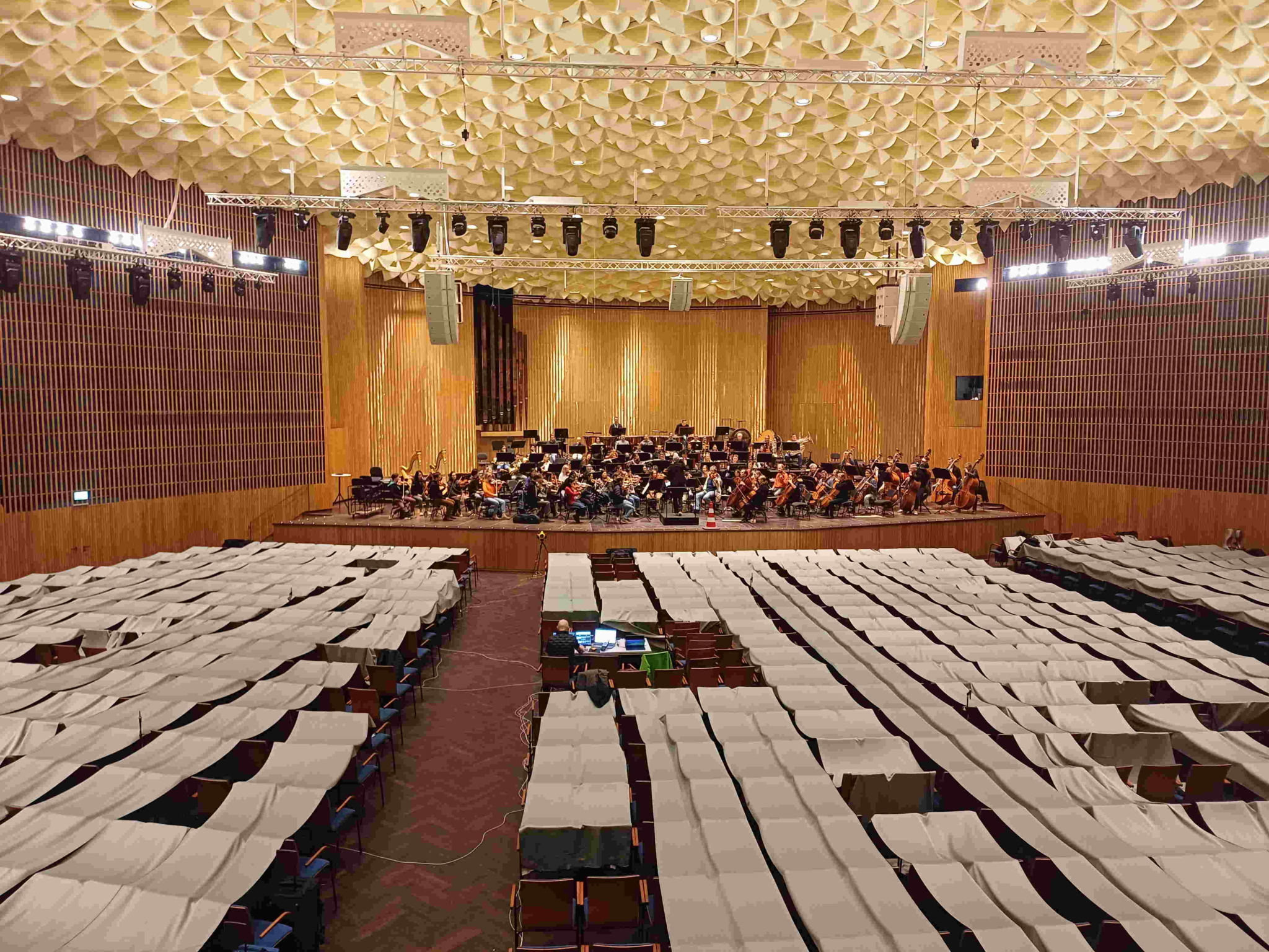 Das Bild zeigt die ersten Proben im großen Saal. Auf den Stühlen befindet sich eine grüne Publikumsimulation, die auch bei den raumakustischen Messungen verwendet wurde. Damit konnten realistische Bedingungen simuliert werden, noch bevor der Saal wieder vom Publikum genutzt wurde.